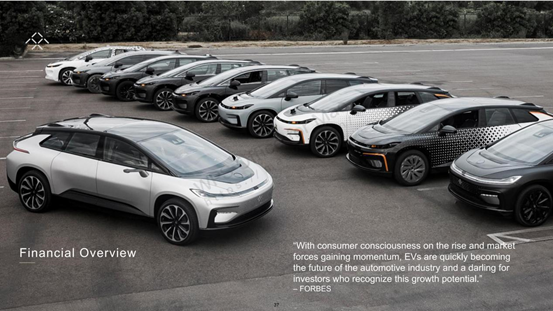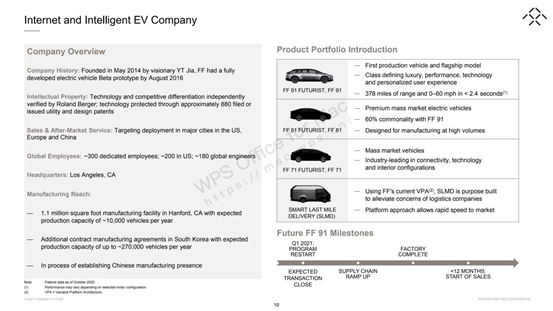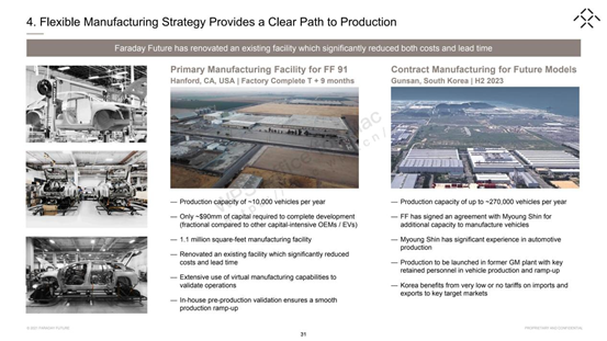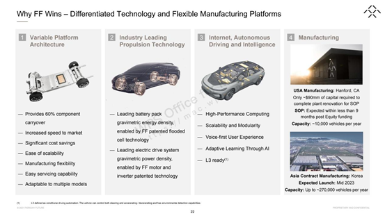 第二十二页:为什么FF会是赢家?因为拥有独一无二的技术和弹性制造平台。包括一个平台可以生产多个车型,提升效率降低成本;领先的动力系统;互联、无人驾驶、智能;制造能力,加州的汉福德工厂还需要9000万美元就能开工生产,预计在本次借壳上市完成后9个月,工厂就能进入生产状态。