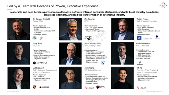 第十二页:FF的专家团队:包括来自玛莎拉蒂、奔驰、丰田、理光、摩托罗拉的员工。值得注意的是,FF中国管理团队有一位名叫Kai Zhao,和乐视网前董秘赵凯同名。