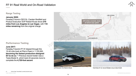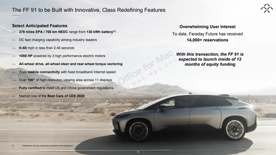 第十三页:详细介绍了FF 91的各项参数。相比国产电动车,甚至特斯拉,FF 91的各项参数都可算顶级,包括使用130千瓦时电池,NEDC续航达到700公里,0-100公里加速2.4秒,3个高性能电机产生了1050马力。目前,已经收到了14000辆的订单。不过订单是否需要定金不得而知。