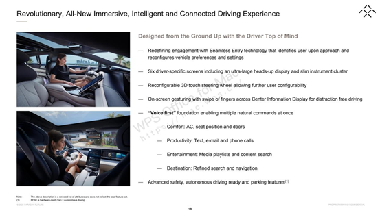 第十八页:描述FF 91 驾驶感受。用词极尽浮夸,“革命性”、“全新的虚拟现实”等。包括自动识别驾驶者、6块屏幕、3D感应方向盘、语音控制等。