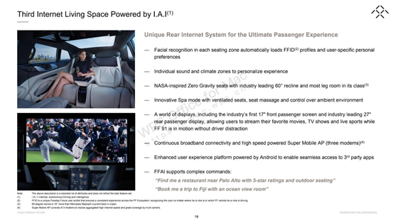 第十九页:I.A.I支持的一个全新的互联网空间。所谓的I.A.I,是指互联网、无人驾驶和智能。包括乘客识别并提供个性化的设置;独立的音响和车内环境体系;零重力的座椅,巨大的乘坐空间;SPA模式,包括按摩座椅;17英寸和27英寸的显示屏,为用户提供电影、电视和体育直播等内容。