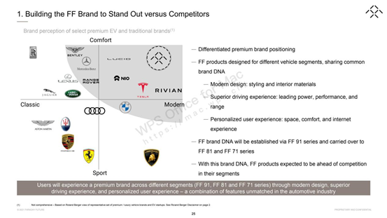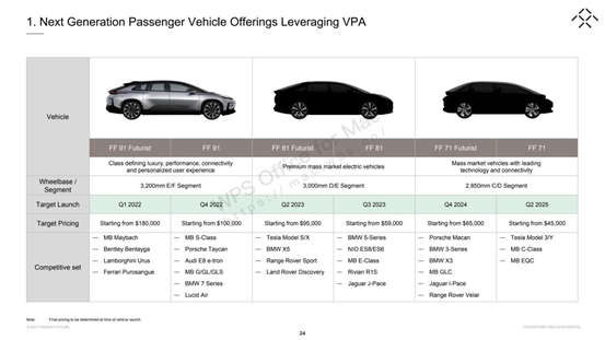 第二十四页:具体介绍FF的三款车型:FF 91,FF 81,FF 71。每一款车型都有两个版本,一个性能版一个基础版。以最接近量产的FF 91为例,性能版将在2022年一季度上市,起售价18万美元,竞争对手是奔驰迈巴赫、宾利添越、兰博基尼Urus、法拉利Purosangue;基础版将在2022年四季度上市,起售价10万美元,竞争对手是奔驰S级、宝马7系、奥迪E8、保时捷Taycan等。
