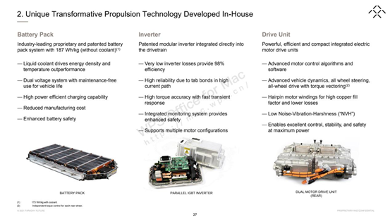 第二十七页:介绍了FF研发的汽车动力系统,包括电池技术、动力转换技术和驾驶单元。比如电池包的能量密度达到了187瓦时/公斤。可做对比的是,特斯拉在2020年9月公布新研发4680电池,能量密度达到了300瓦时/公斤。蔚来在今年1月也推出了超过300瓦时/公斤的电池包,续航超过1000公里。