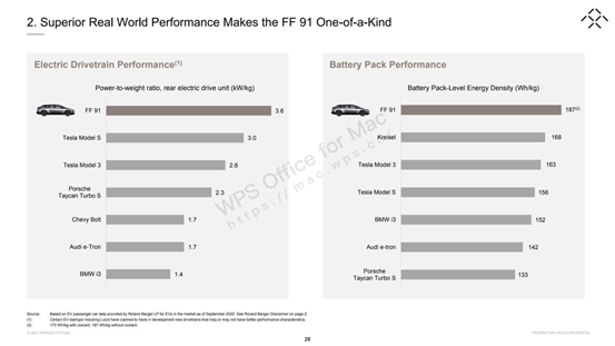 第二十八页:用了两个指标,动力车重比和电池密度,告诉投资者FF 91为何优于市场现有车型。