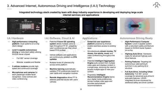 第二十九页:详细说明了FF的互联、自动驾驶和智能技术,包括硬件、软件、应用程序。