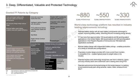 第三十页:FF在全球拥有880项专利,其中550项已经申请成功,330项是正在申请的。分国家看,在美国有240项专利,在中国有600项。
