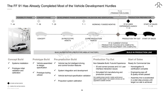第三十四页:FF 91车型已经做好了上市的各项准备。只要钱到位,9个月后就能上市,12个月就能交付。