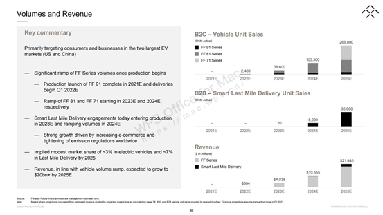 第三十九页:FF的销量和收入预测。预计到2025年,FF系列销量将达到26.66万辆,货车销量将达到35000辆,销售收入达到214亿美元。