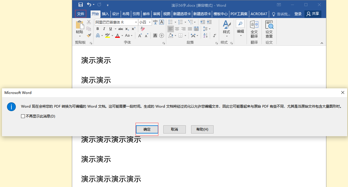 操作步骤:打开Word,点击【文件】,选择【打开】,然后找到文件所在位置双击打开,这个时候会弹出提示的对话框,选择【确定】就可以啦。