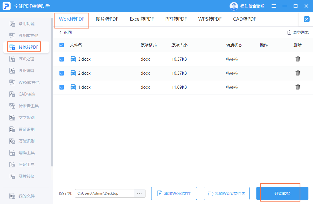 打开软件,点击【其它转PDF】,然后选择【Word转PDF】,添加Word文件,一次可以添加多个文件进行批量转换,接下来点击【开始转换】就可以了。
