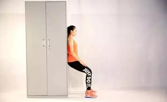 双脚与肩同宽,躯干靠墙贴紧,双脚与墙面之间的距离比大腿长度略小一点,然后慢慢下蹲,到膝关节屈曲约100°角的位置,保持静止20秒,再缓慢站起还原,重复这个练习动作。