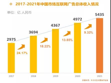 报告显示,2021年互联网行业实现了广告收入 5435 亿人民币,同比增长 9.32%!