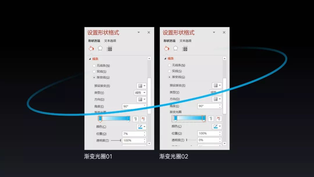 可能有些朋友会疑惑,卫星的轨道是怎么做的?其实很简单,我们只需要设置椭圆渐变透明,然后旋转一定角度即可:
