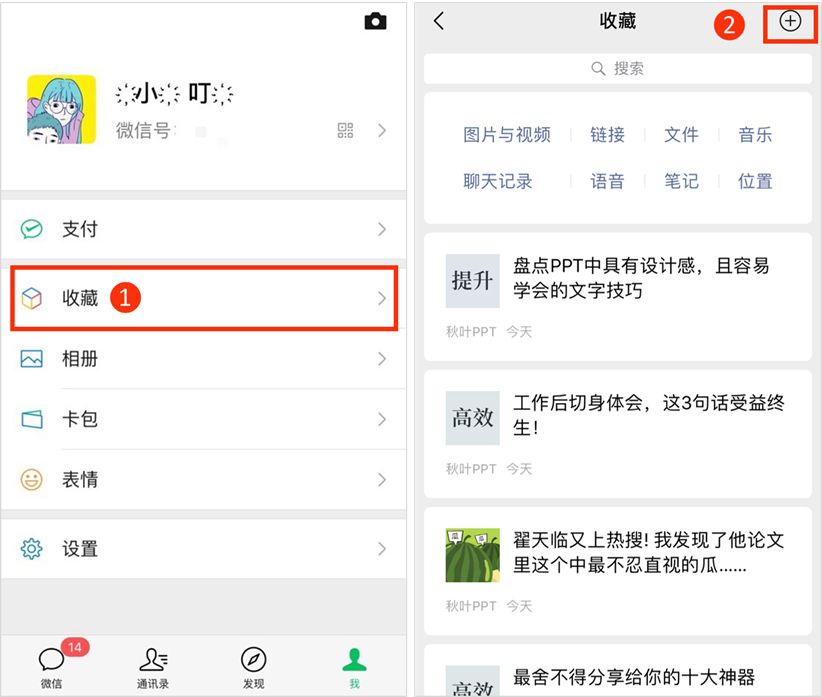 我们先截好要拼接的图片,然后打开微信,依次点击【我】-【收藏】-点击右上角的【+】,进入微信笔记功能的界面: