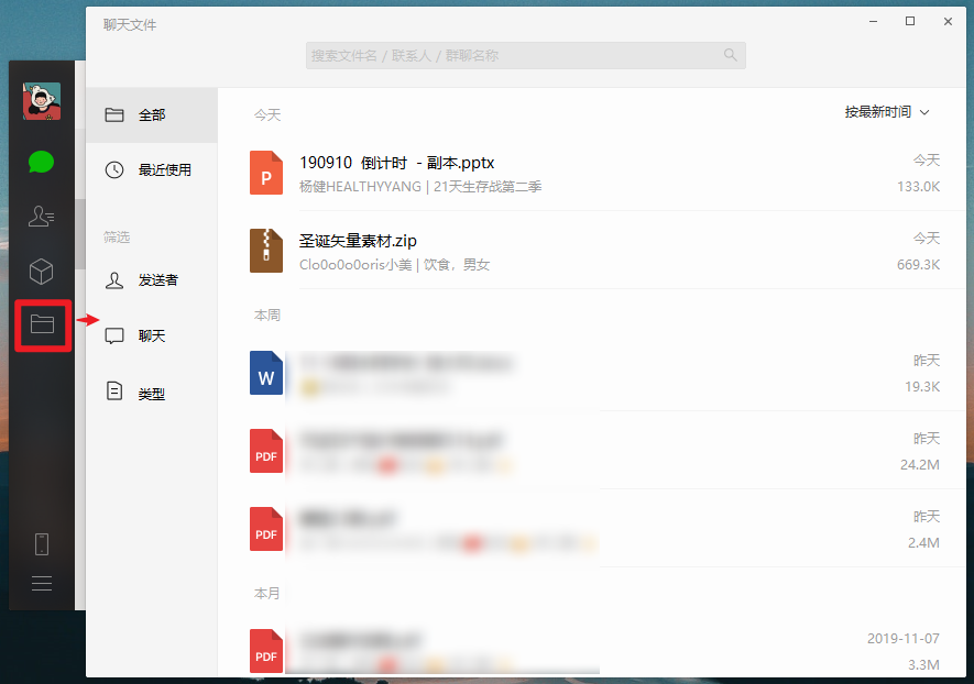 可以搜索文件名、联系人、群聊名称,还能按照发送者、聊天对象、文件类型等进行筛选~
