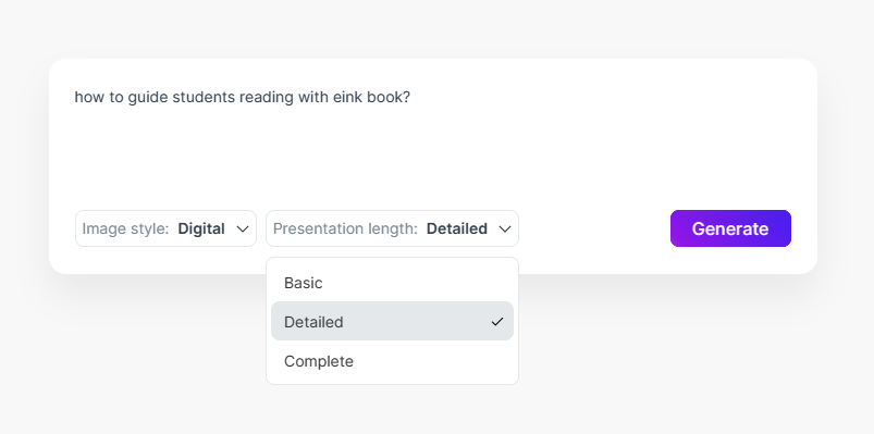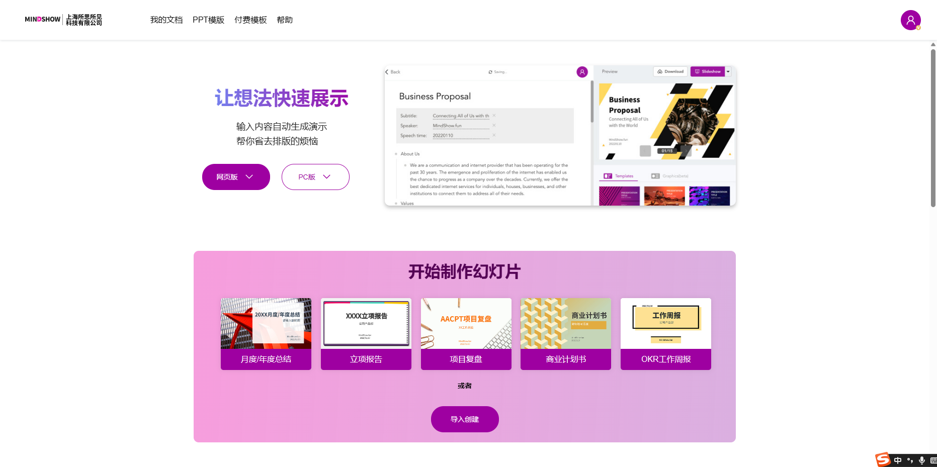 Mindshow是一款极简PPT制作工具,支持导入文本大纲来智能生成在线PPT,支持导出为PDF和PPTX(可编辑)。