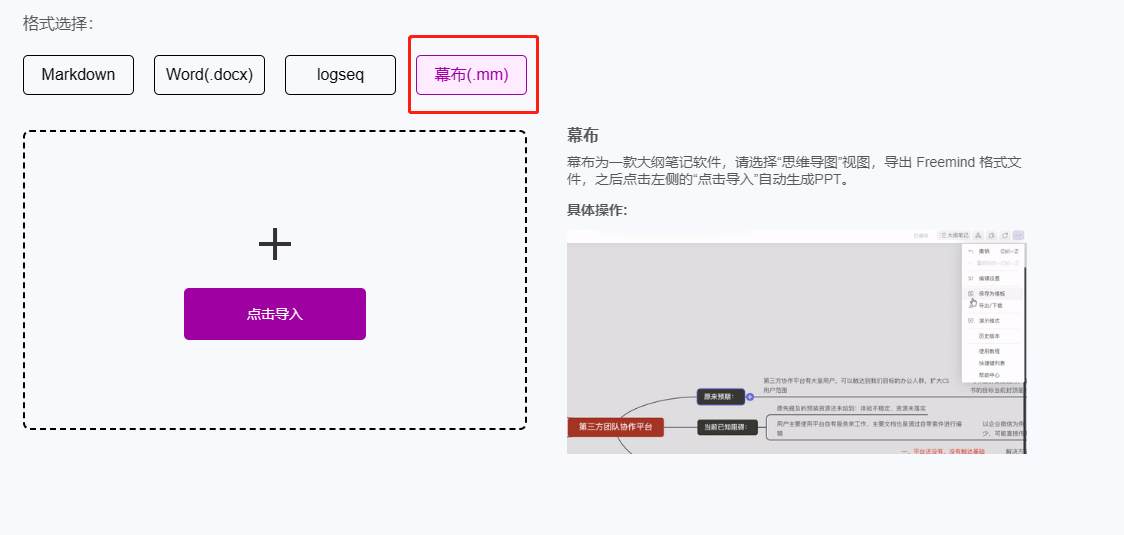 最新版本还支持直接导入幕布的mm思维导图大纲,直接生成PPT,这个绝对是思维导图用户的大爱。