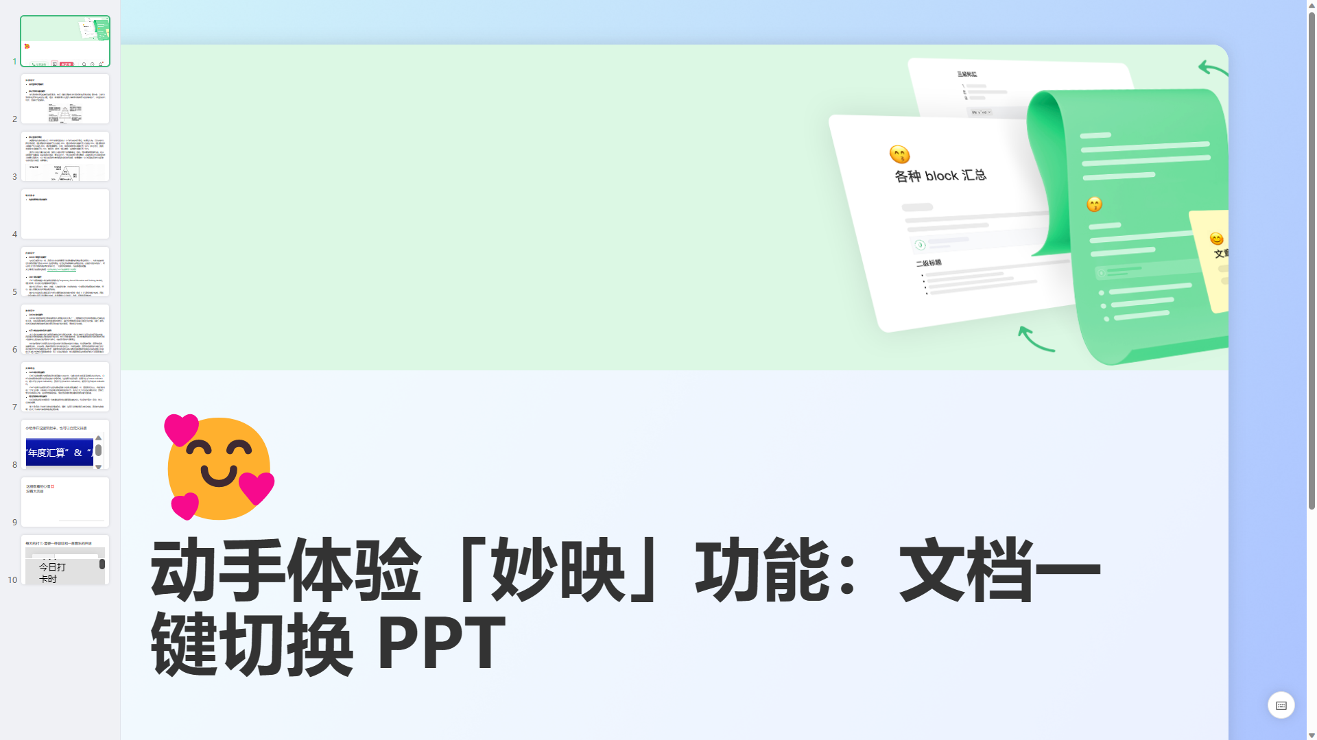 特别是其独有的“妙映”功能,可以一键将文档转换为PPT演示。