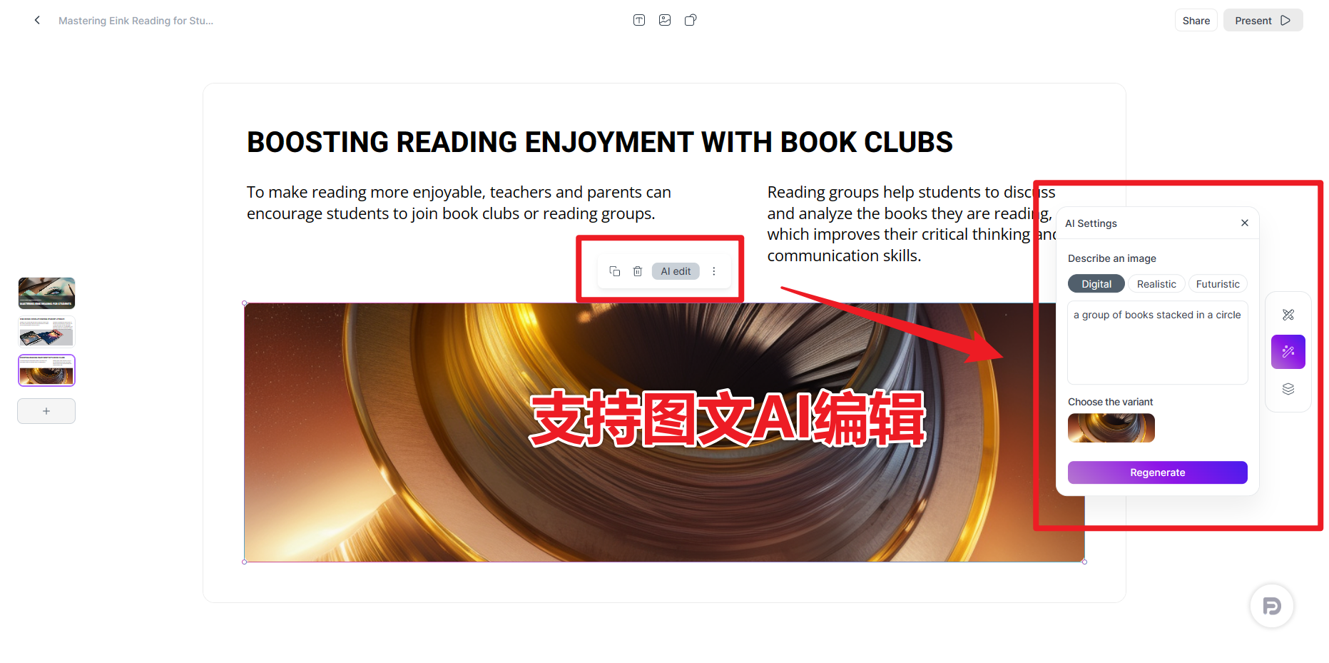 在使用Prezo的时候,我们只需要输入关键短语就可以自动生成一整套PPT,而且选中图文内容还可以进入AI编辑,其图片AI生成支持Stable Diffusion提示语修正,可以极速生成图片,文本则支持AI改写和缩写。