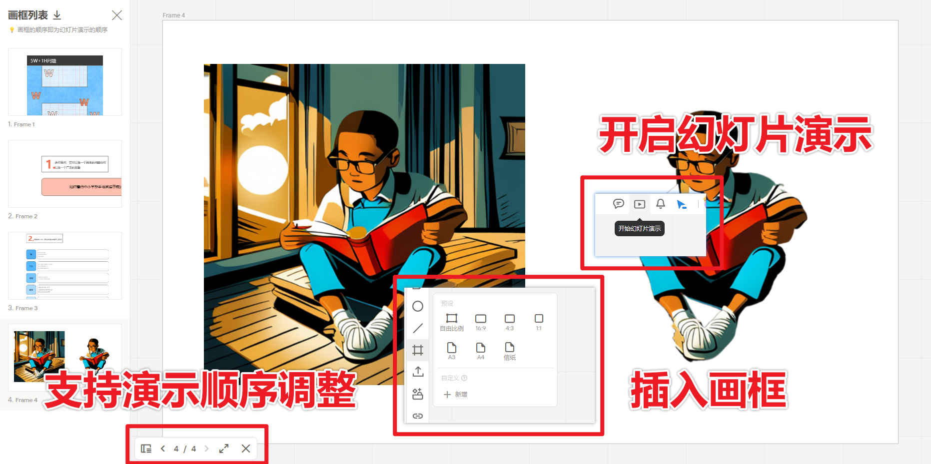 Fabrie AI转PPT播放很方便,只需要在完成的互动白板上添加画框就可以一键变成PPT进行演示播放。