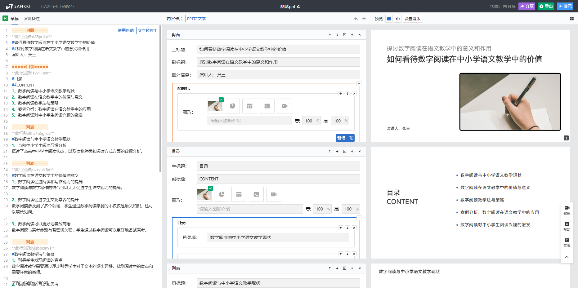 相较于Mindshow,闪击PPT提供了更多编辑属性,支持拖拽式编辑和智能页面生成,可以插入图片、表格、视频等多种格式,支持导出PPT(可编辑格式需要付费使用)。