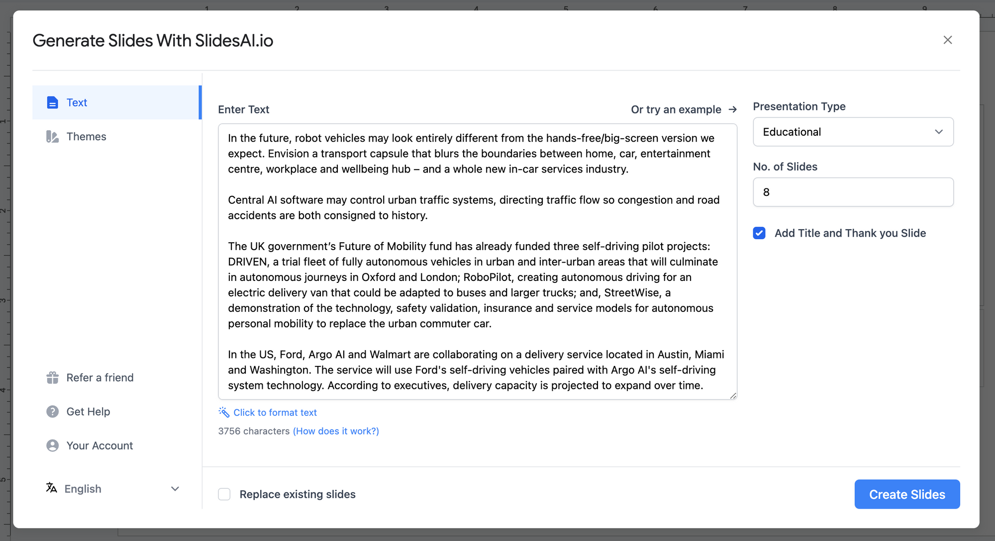 优点:深度集成在谷歌幻灯片中,可以直接将全篇文稿粘贴在文本区,AI智能识别内容要点,并根据相应风格和页数设计好幻灯片。