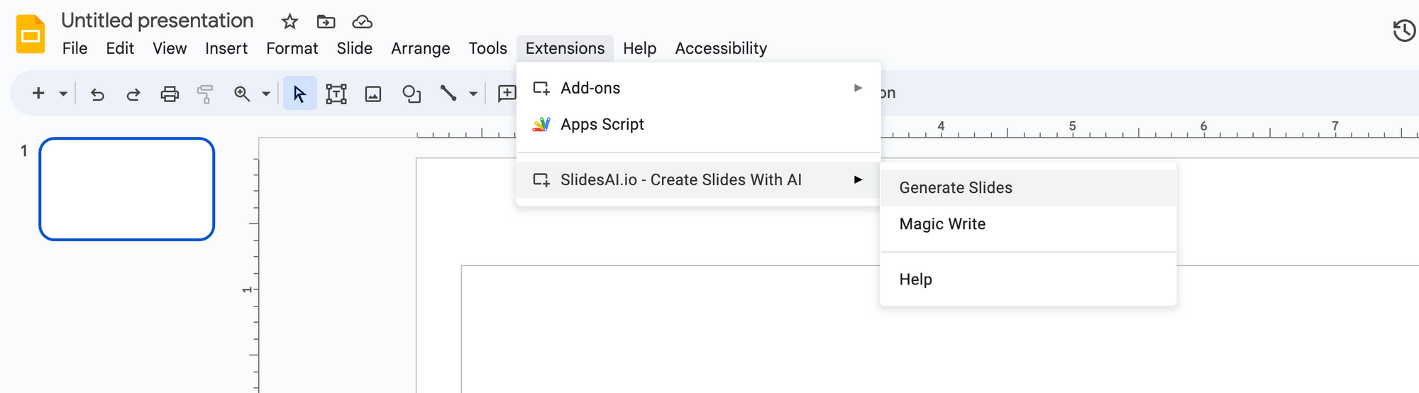 现在您可以在以下位置Extensions → SlidesAI.io → Generate Slides 找到幻灯片AI
