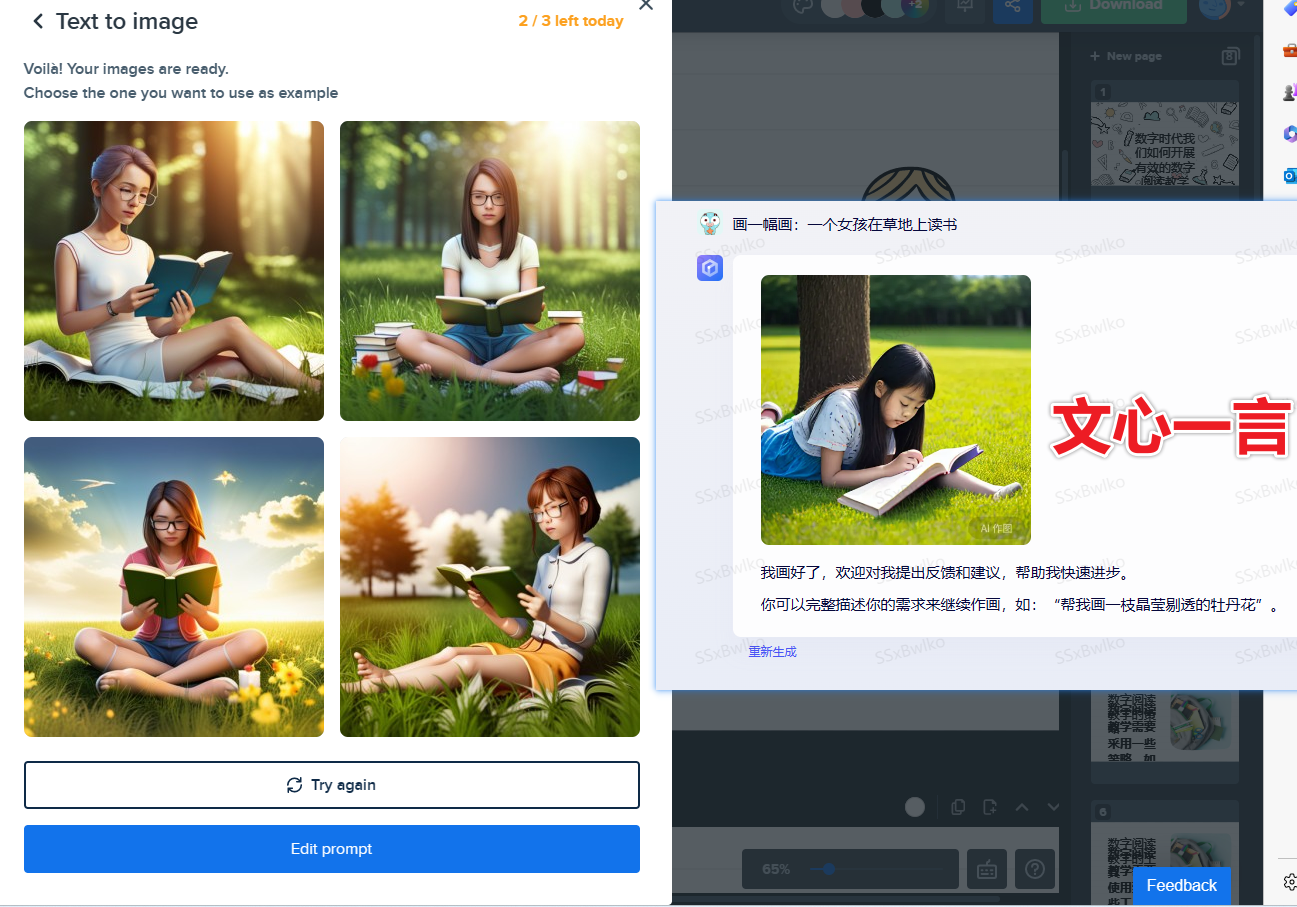 生成的PPT支持常见的模板切换、图文添加之外,还支持文字转图片的AI绘图功能,每天限制使用3次。