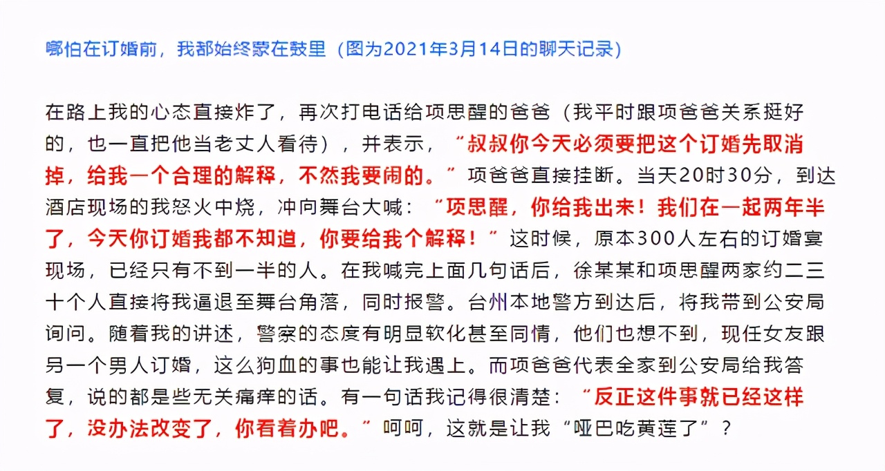 张科峰自然不信,赶到现场才发现,果然是自己女朋友要跟别人订婚,后来双方就闹到了公安局。再后来张科峰才发现,原来和他同居长达2年半且早已私定终身的网红女友早就与他人相亲相爱了。