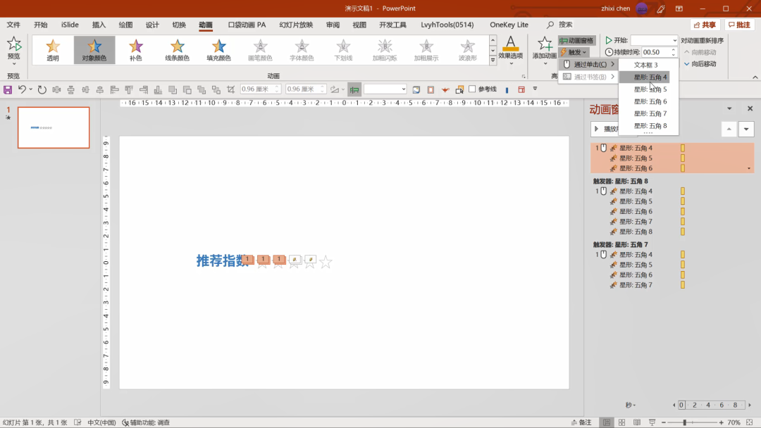与此对应的还有动画效果的实现——例如第28个视频案例,讲的是如何用触发器动画来制作「星级评比」动画: