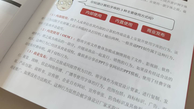 毕竟,读者并不是要去参加考试啊!他们其实不需要详细了解这些概念,只需要知道不尊重字体版权可能带来的严重后果,进而在使用字体时有所警觉就OK了。