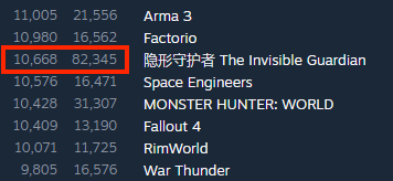 由于没有第一时间截图,所以小编只能通过各游戏的24小时巅峰在线人数得出昨晚《隐形守护者》排在了Steam在线榜的第6位。而早些时候被誉为国产游戏之光的《太吾绘卷》在线人数也只有72196人,另一款大火的国产游戏《中国式家长》的巅峰在线人数则为32527人,可以说《隐形守护者》在昨晚达到了国产游戏在Steam上的新高峰。