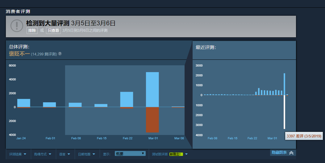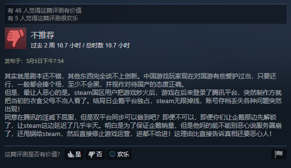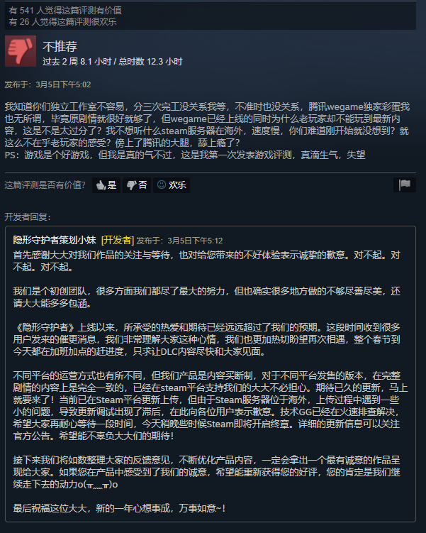 然而本作却在昨晚被3397个玩家打出了差评,主要原因是《隐形守护者》登陆了Wegame平台,然而Steam平台却比Wegame平台延迟上线,这让很多玩家大感不满,认为工作室是在“卸磨杀驴”,以及作为单机播片游戏还要遭受掉线之苦。