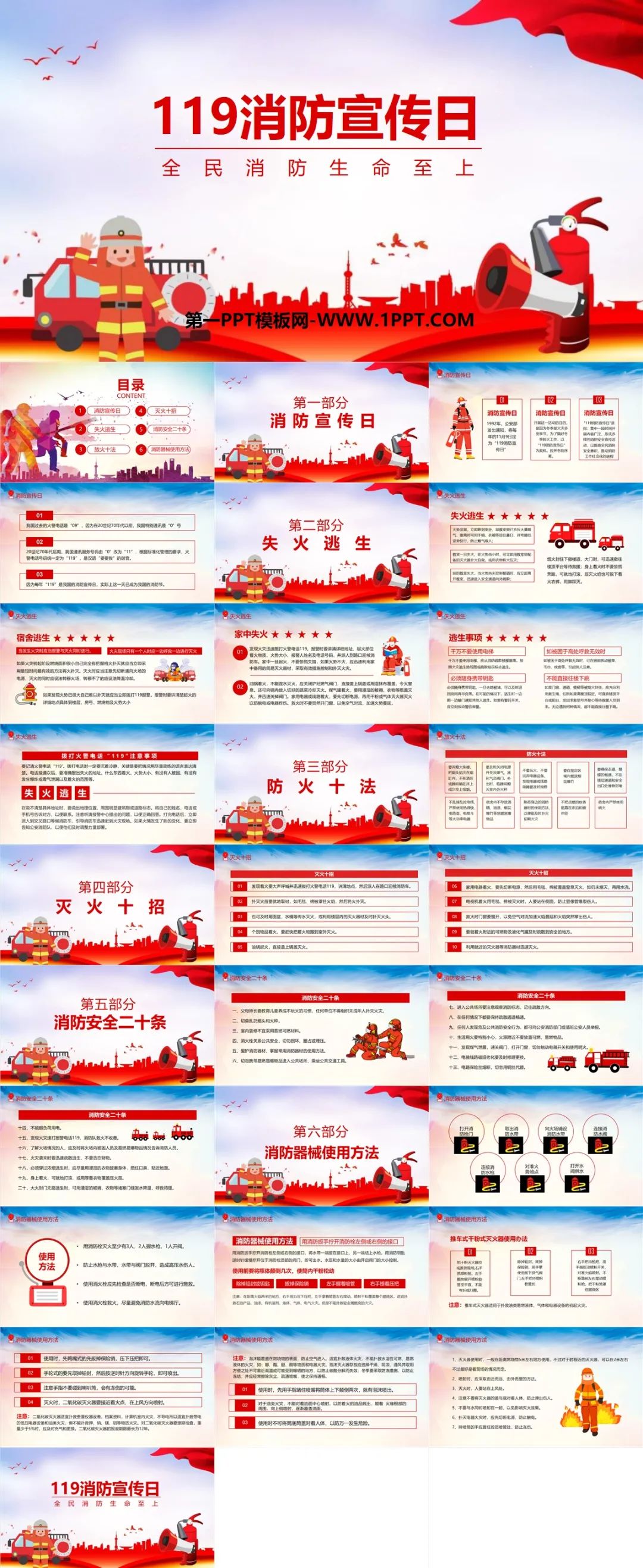 8.部分模板示例如下:119全国消防宣传日PPT模板消防安全培训及应急演练主题教育课件PPT模板宣传PPT动态PPT消防全教育消防宣传月安全教育消防与救援安全知识讲座ppt模板5套119全国消防日主题PPT模板,免费下载方法如下:步骤1:在文章底部右下角点个赞步骤2:关注本头条账号,私信回复信息"119"
