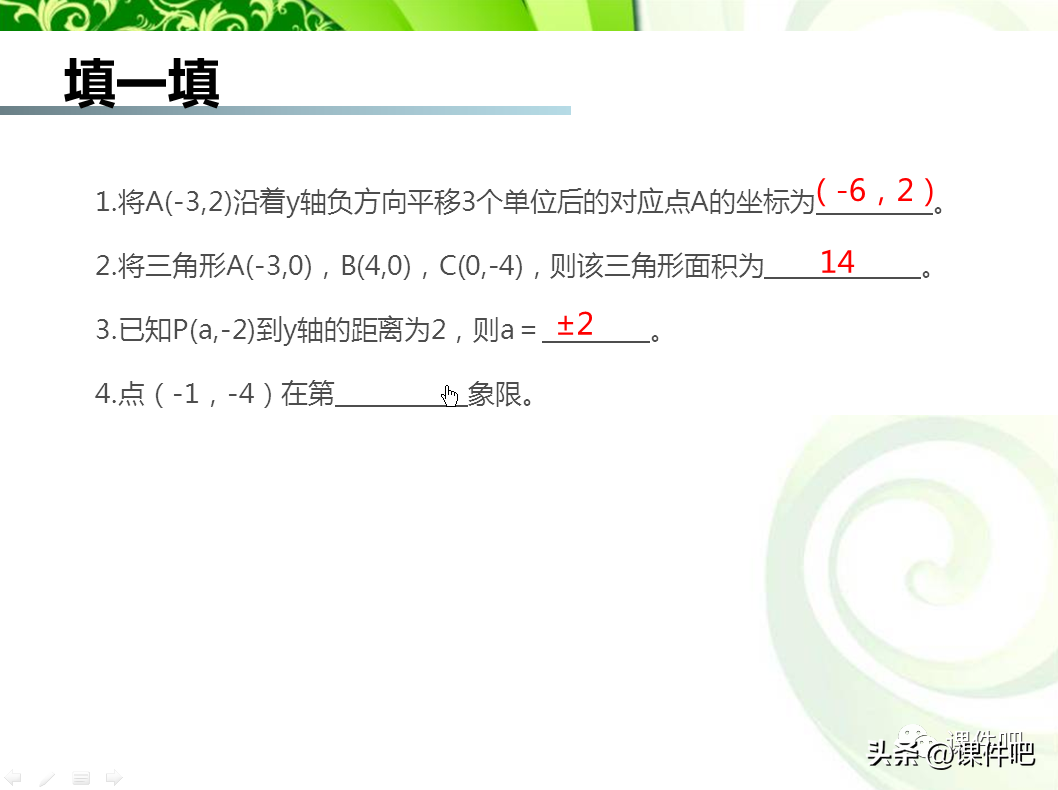 在PowerPoint课件中制作填空题的一种方案是,将题目和答案放置在同一张幻灯片中,为答案添加进入动画效果,然后绘制透明形状覆盖答案,以这个透明形状作为触发器来触发答案的进入动画使答案显示。具体的制作方法如下所述。