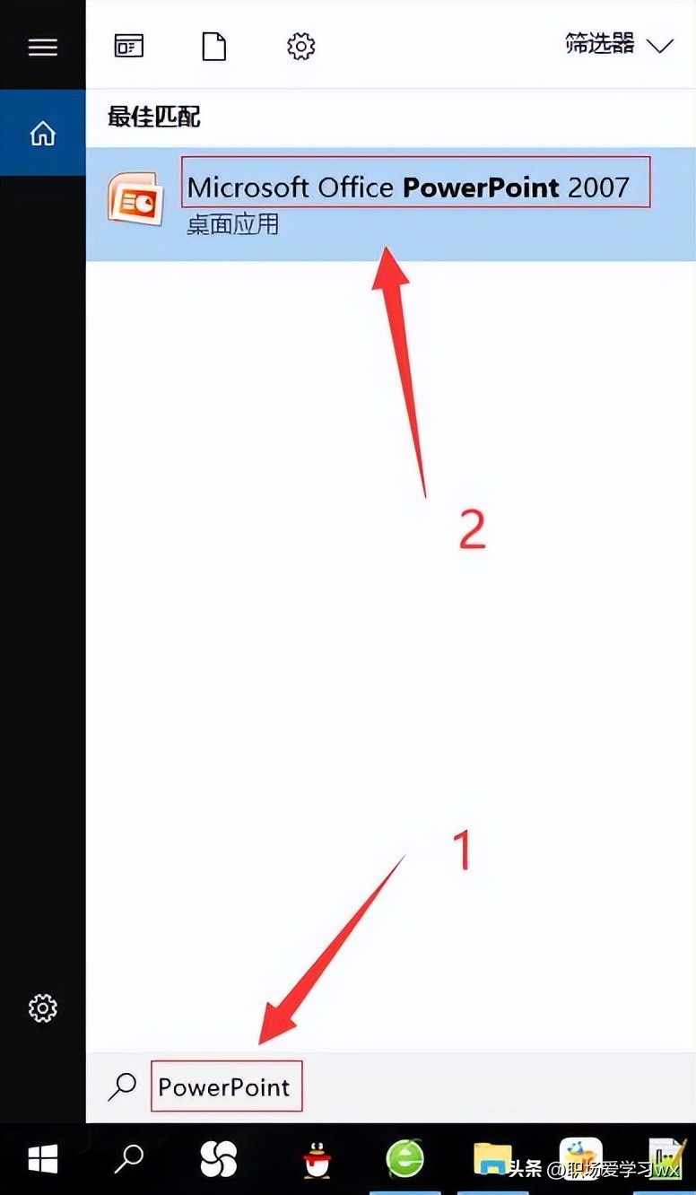 点击电脑左下角的搜索按钮,输入“PowerPoint”,鼠标左键点击,打开PPT界面。