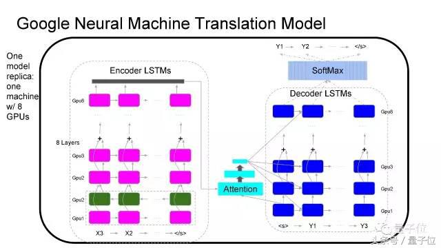 这是我们模型的结构,它包含很深的LSTM stack,每一层运行在不同的GPU上;还有一个注意力模块,追踪所有的状态,决定在生成输出序列的各部分时,分别该注意输入数据中的哪一部分。