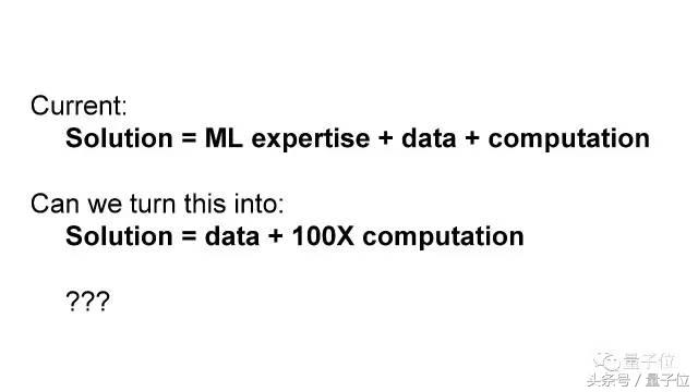 我们研究的解决方案,是数据+100倍的计算力,这中间不需要人类机器学习专家。如果能做到这一点,世界上会有更多的组织和数据能受益于机器学习。