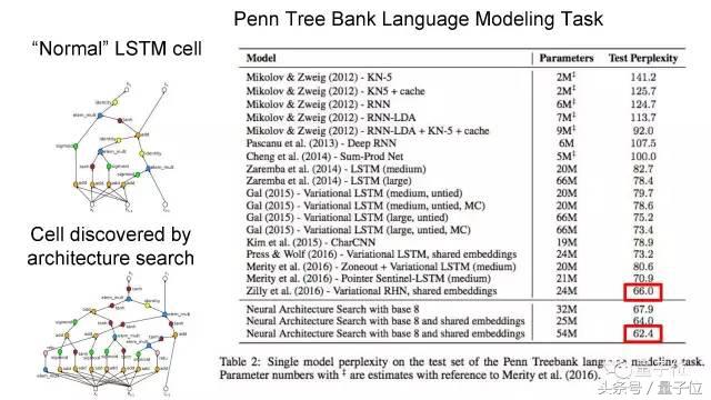 我们还在Penn Treebank数据集上,尝试了一个语言建模任务。我们只是给了架构搜索一个LSTM cell,然后让它寻找处理顺序数据的方法。在这个案例中,架构搜索的方法比此前最先进的方法表现更好。