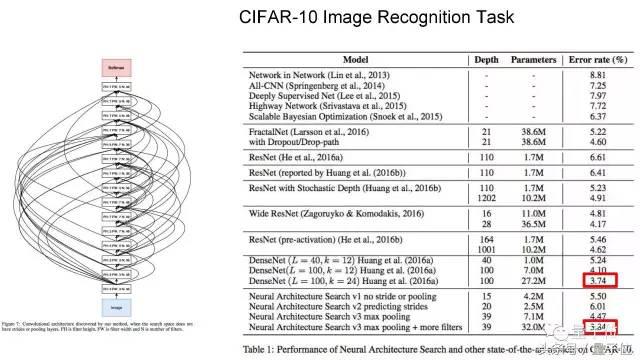 这是一个例子。这个模型看起来就不像人类设计的东西,这些连线有点疯狂。这是CIFAR-10数据集上的一个应用,架构搜索的方法已经非常接近目前最先进的技术,这中间并没有人对底层架构进行过干预。