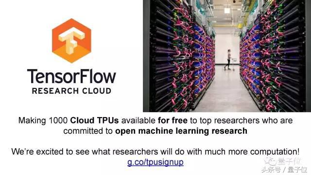 我们还把上千台这样的设备,免费提供给全球的研发人员使用,只要你致力于有趣的研究,需要更多的计算力,而且承诺会公开研究成果。我们想要构建一个科学和机器学习研究的生态系统,我们也希望得到使用TPU的反馈。