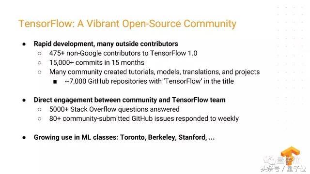 TensorFlow在全世界有近千人的外部贡献者,为它增加功能、修复bug、改进系统。