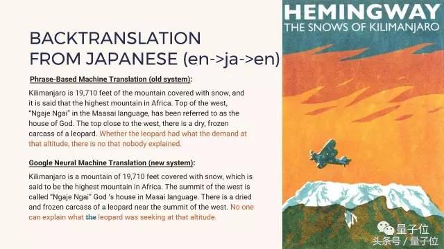 这是一位日本教授把海明威《乞力马扎罗的雪》第一段从英语翻译成日语、再从日语翻译回来的结果。上边是基于短语的统计模型的结果,下边是神经网络模型的结果。