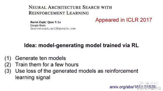 架构搜索。这个想法,是想用一个模型生成另一个模型。目前的机器学习中,设计神经网络的架构仍然需要大量的专业知识并且耗费大量时间。在这个研究中,我们生成10个模型架构,分别训练数小时,然后使用生成模型的损失,作为强化学习的信号。