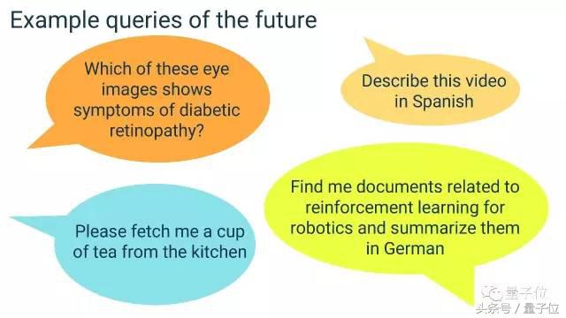 这是一些未来会实现的需求。例如通过图像来发现糖尿病引发的视网膜病变;用西班牙语描述一段视频;让机器人从厨房沏一杯茶来;帮我找到与机器人强化学习有关的文档,并用德语总结出来。