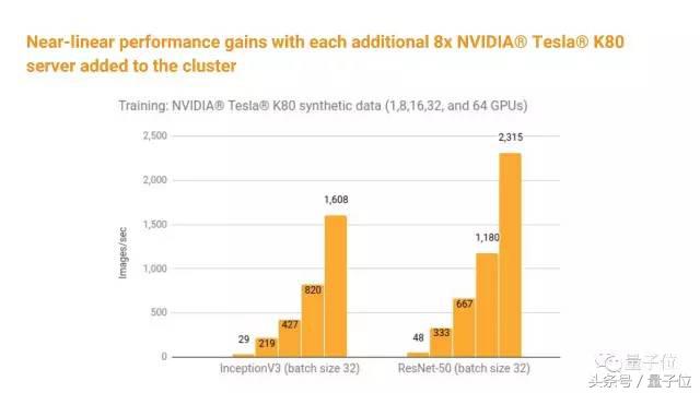 在很多任务上,TensorFlow支持多达64个GPU,还能随着GPU的增加保持性能的线性提升。