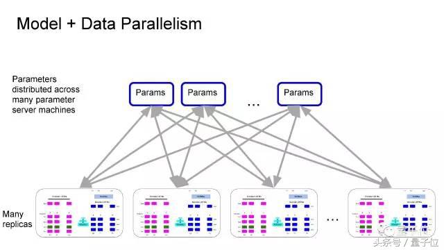每一份这个模型都运行在一台GPU机器上。我们把这个模型复制了很多份,在训练数据上进行平行训练,然后共享学到的参数。