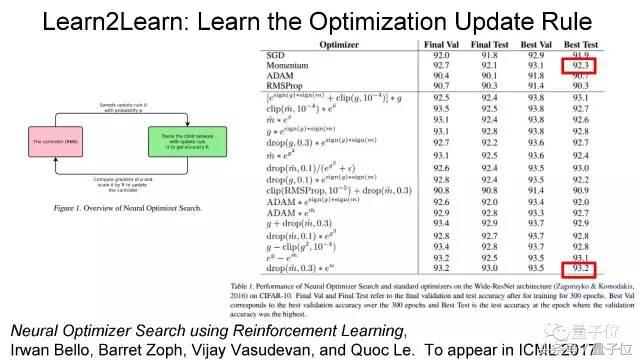常见的优化方法都是类似的。经常使用的方法包括SGD(随机梯度下降)、Momentum、ADAM、RMSProp等。在这一页可以看到,自动化的方法提出了15种完全不同的表达式,而且表现基本都优于人类设计的优化方法。