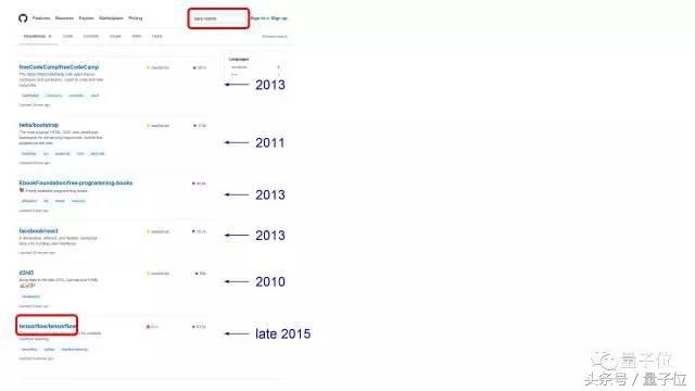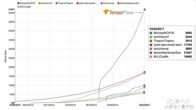这是GitHub星标数的趋势图,你可以看到TensorFlow与其他机器学习框架的对比。