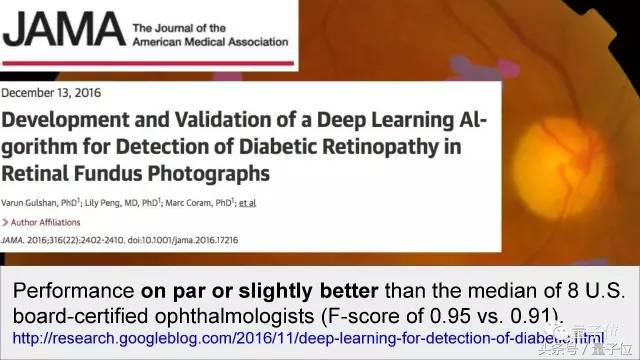 最后,我们获得了一个识别糖尿病视网膜病变的算法,和8名协会认证的眼科专家相比,算法的准确率和他们的中位数持平,有时还要高出一点。